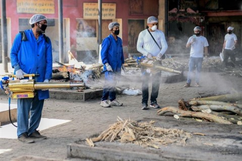 | Des bénévoles désinfectent un lieu de crémation hindoue, le 11 avril à Amritsar, en Inde. |