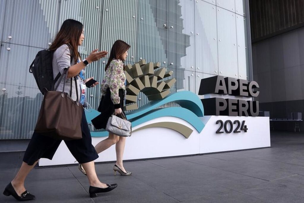 | Photo prise le 13 novembre 2024 de personnes passant devant le logo de l'APEC 2024 à l'extérieur du Centre de Convention de Lima, à Lima, au Pérou. |