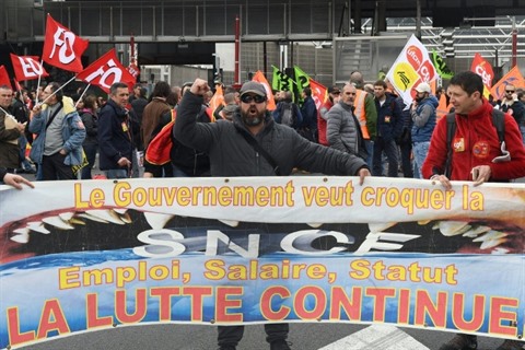 | Manifestation à Marseille contre la réforme de la Société nationale des chemins de fer (SNCF) le 9 avril. |