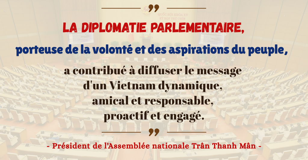 À ce jour, l’Assemblée nationale du Vietnam a pris une ampleur considérable, ayant établi des relations parlementaires avec plus de 140 pays. S'exprimant sur la synergie de la diplomatie nationale, Trân Thanh Mân a déclaré que "la diplomatie parlementaire est devenue un canal essentiel, complétant les relations extérieures du Parti et la diplomatie d'État, créant une force combinée pour la diplomatie vietnamienne moderne et rehausser la position du pays sur la scène internationale".