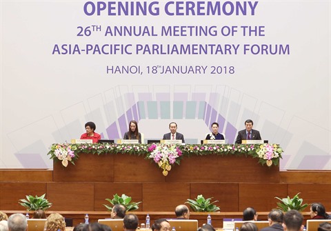 À la suite des réalisations en 2017, l’Assemblée nationale a organisé avec succès, du 18 au 21 janvier 2018, la 26e conférence annuelle du Forum parlementaire Asie-Pacifique (APPF-26) sous le thème "Partenariat parlementaire pour la Paix, l’Innovation et le Développement durable". Cette conférence importante témoigne du soutien des parlements régionaux pour la Déclaration de Dà Nang adoptée lors de la 25e conférence des dirigeants des économies membres de l’APEC, tenue en novembre 2017 au Vietnam.