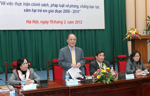 | Le président de l'AN, Nguyên Sinh Hùng, à la réunion consacrée à l'application des politiques et droits sur la prévention et la lutte contre la violence et les abus à l'encontre des enfants, le 15 février à Hanoi. |