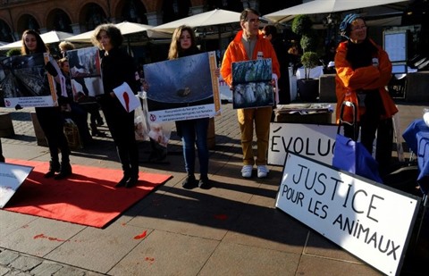 | Des membres de l'association de défense des animaux L214, le 21 décembre 2016, lors d'une manifestation à Toulouse. |