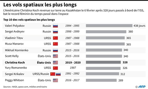 Astronaute de la NASA, Christina Koch, 41 ans, est restée à bord de l'ISS 328 jours, soit quelque 11 mois, battant ainsi le record précédent établi par Peggy Whitson, la vétérane de l'espace.
