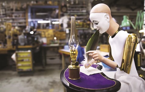 Dans son atelier, les roues dentées et les pistons le disputent aux papillons mécaniques, à un cheval au petit galop, des boîtes à musique du XIXe siècle et des oiseaux géants aux couleurs chamarrées. Ajoutant à l’atmosphère baroque, parmi une foule d’outils, trône un squelette coiffé d’un chapeau à plume qui sert à modéliser les mouvements, des bras et des jambes qui pendent du plafond au-dessus d’étagères chargées de têtes miniatures sous le regard d’un œil géant dont l’iris fait de la musique en tournant.