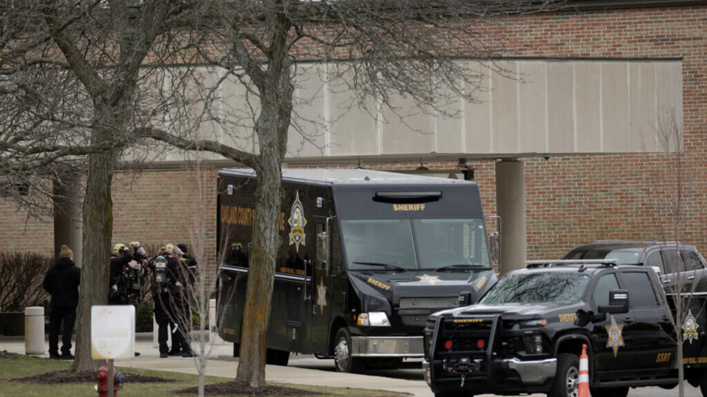 | Les forces de l’ordre interviennent sur les lieux d’une fusillade devant la synagogue Temple Israel, à West Bloomfield, dans la banlieue de Détroit, dans le Michigan, le 12 mars 2026. |