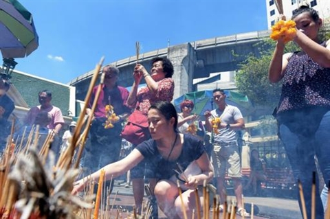 | Des habitants font des offrandes au temple d'Erawan où 20 personnes ont été tuées le 17 août, le 20 août à Bangkok. |