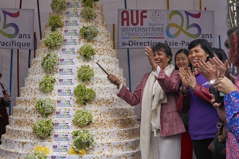 Des parts du gâteau géant, fabriqué par la pâtisserie Saint Honoré, ont été offertes à tous les francophiles présents, une friandise des plus appréciées pour féliciter le parcours de plus d’un quart de siècle de l’AUF dans la région Asie-Pacifique et au Vietnam en particulier.