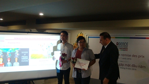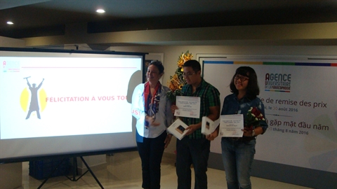 Puis, l’AUF a remis les prix du concours de dessin et de vidéo. Intitulé «Étudiants francophones à l’ère du numérique», le concours de dessin a été lancé en novembre 2015 en faveur des étudiants francophones de la région Asie-Pacifique. L’objectif était de proposer un dessin créatif pour décorer les Campus numériques Francophones (CNF) de l’AUF en Asie-Pacifique. L’organisateur a reçu 33 créations réalisées par des étudiants de cinq pays de la région (Cambodge, Indonésie, Laos, Mongolie et Vietnam). Et c’est le dessin Originalité, de Ta Lê Minh (Département de français de l’Université de Hanoï et de Ngo Thành Long (Académie de la diplomatie du Vietnam), qui a remporté le premier prix. Le deuxième prix a été attribué à Lê Hoàng Duong, du Département de langue et de civilisation française de l’Université de langues et d’études internationales avec son œuvre L’ère numérique - Un nouvel horizon pour les étudiants.