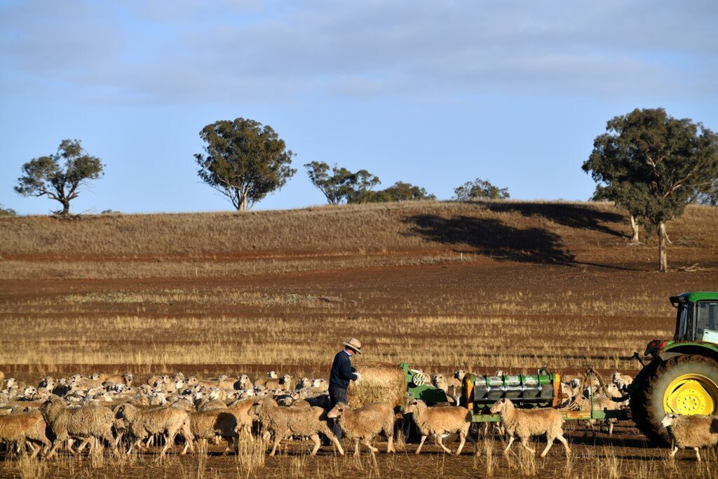| Une troupe de moutons sur un champs asséché par la sécheresse à Nouvelle-Galles du Sud, en Australie. |