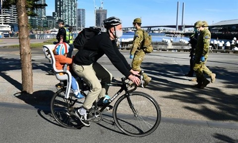 | Un cycliste passe devant un groupe de policiers et soldats qui patrouillent à Melbourne (Australie), le 2 août. |