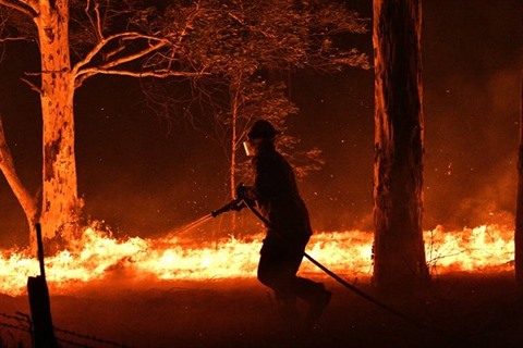 | Un pompier luttant contre les feux de forêts le 31 décembre 2019 près de la ville de Nowra (Nouvelle-Galles du Sud). |
