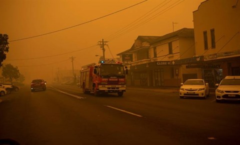 | Un camion de pompiers traverse la ville de Bombala noyée dans les fumées, le 31 décembre 2019. |