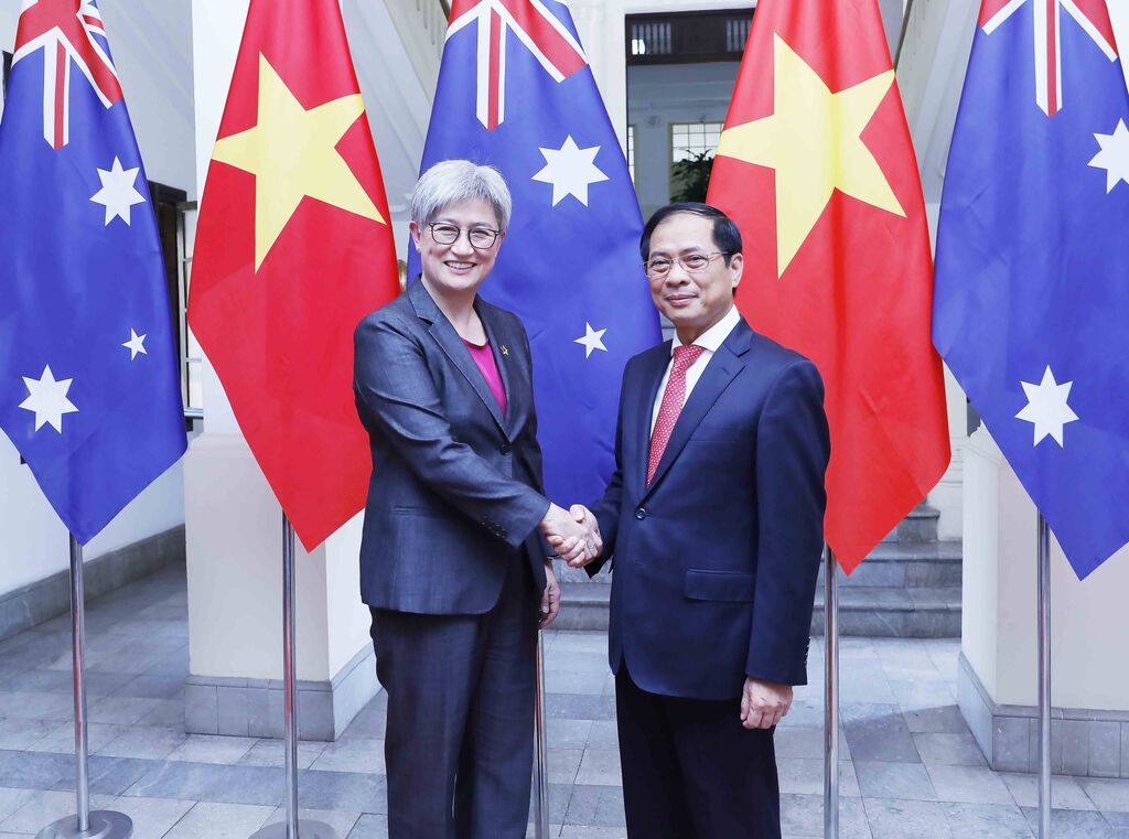 | La ministre australienne des Affaires étrangères, Penny Wong, et son homologue vietnamien Bùi Thanh Son, lors de la visite de la ministre au Vietnam en août 2023. |