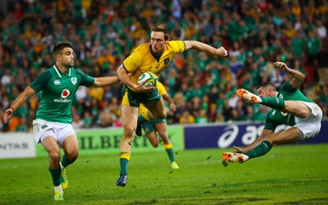| L'Australien Dane Haylett-Petty (centre) à la lutte avec les Irlandais Johnny Sexton (gauche) et Rob Kearney (droite) lors d'un test-match à Brisbane, le 9 juin. |
