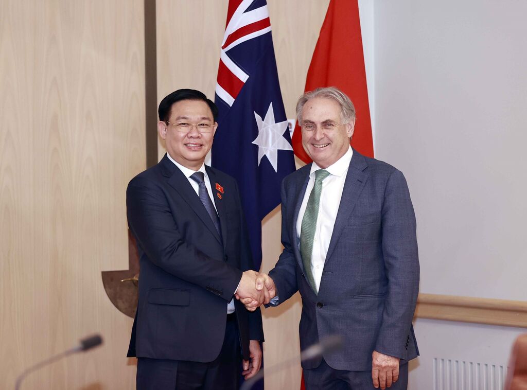 | Le président de l'Assemblée nationale du Vietnam, Vuong Dinh Huê (gauche), reçoit le ministre australien du Commerce et du Tourisme, Don Farrell à Hanoï le 30 novembre 2022. |