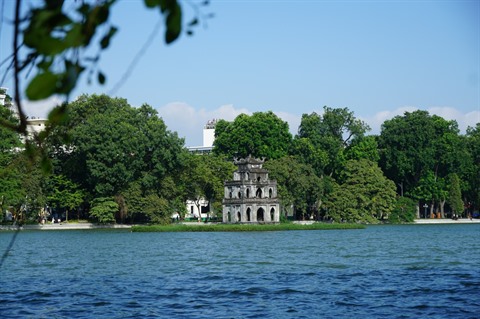 | La tour de la Tortue, située au cœur du lac Hoàn Kiêm, au petit matin. |