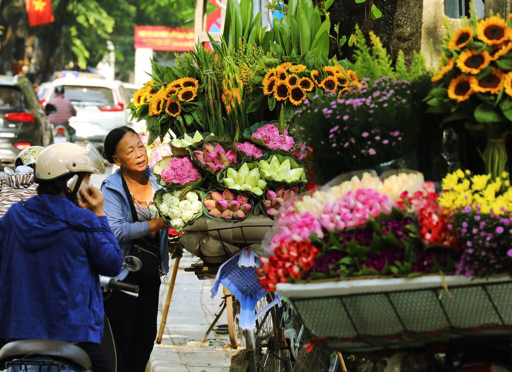 | Une vendeuse ambulante de fleurs dans la rue Thuy Khuê, à Hanoï. |