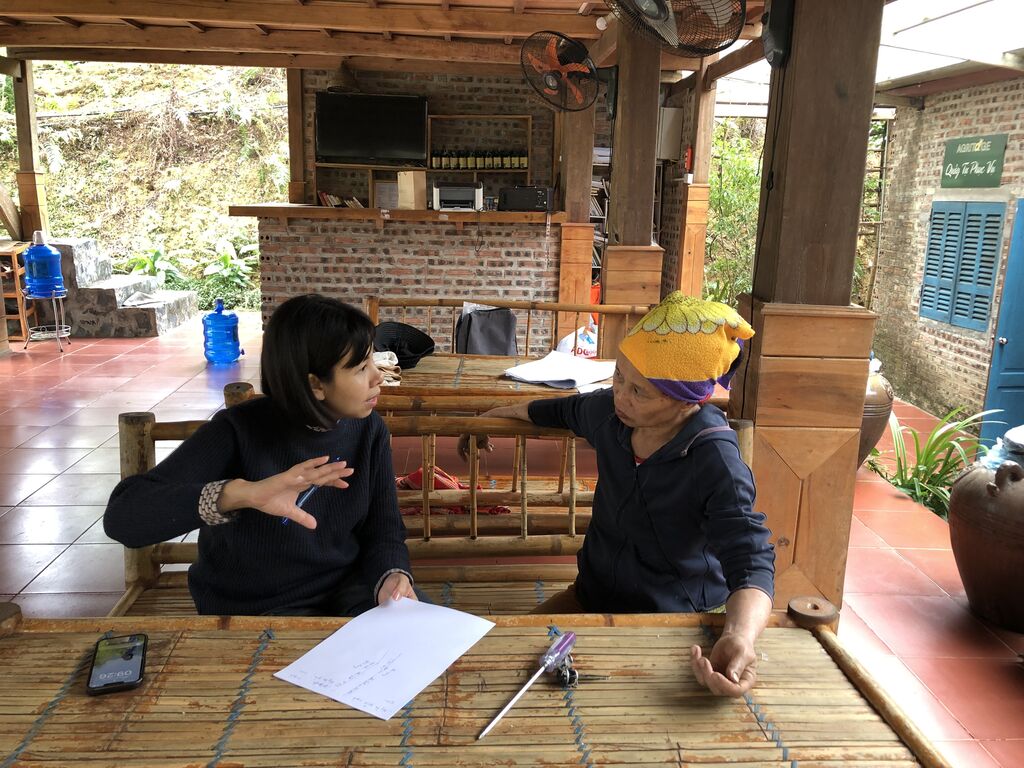 | Dinh Thi Huyên, directrice du Centre de coopération pour le développement du Nord-Ouest (TABA) (gauche) discute du plan d'accueil de visiteurs avec Hà Thi Soan, une femme de l'ethnie Thai participant au projet. |