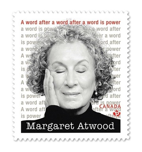 Le nouveau timbre de Poste Canada présente un portrait de Margaret Atwood les yeux fermés et une main contre la joue, avec la mention A word after a word after a word is power (Un mot après un mot après un mot, c'est le pouvoir), un vers tiré de son poème Spelling.