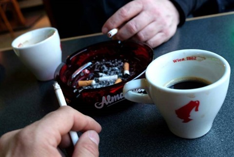 | Des clients d'un café de Vienne fument en prenant un café le 22 mars 2018. |