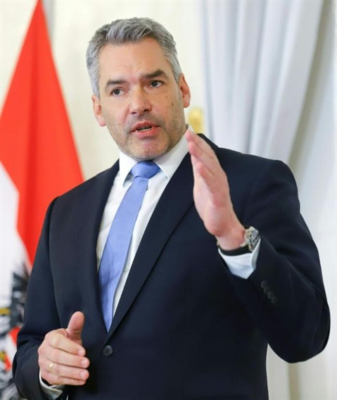 | Le chancelier autrichien Karl Nehammer lors d'une conférence de presse, le 16 janvier à Vienne. |