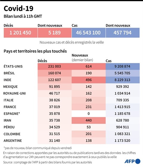 L'épidémie de COVID-19 a fait au moins 1,2 million de morts dans le monde, pour 46.452.818 cas, selon un comptage réalisé par l'AFP à partir de sources officielles lundi 2 nouvembre.