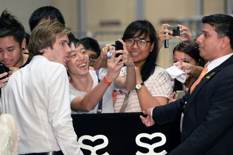 | La star des "Youtubers", le Suédois Felix Kjellberg, alias PewDiePie (gauche), pose pour un selfie avec un de ses fans, à Singapour, mai 2013. |