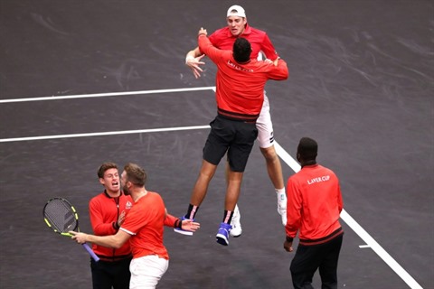 | L'équipe du Reste du Monde exulte après être passée en tête devant l'Europe à la Laver Cup, le 23 septembre à Chicago. |