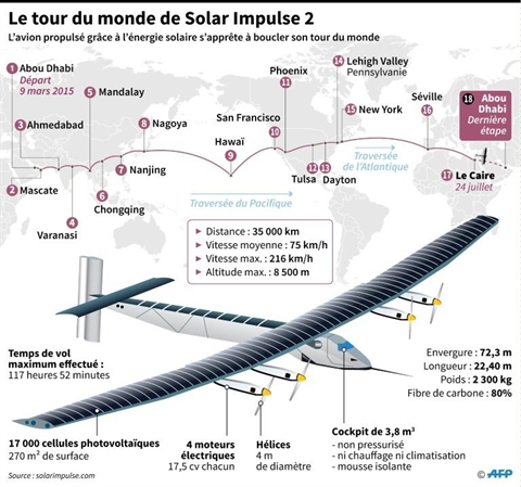 Pesant une tonne et demi mais aussi large qu'un Boeing 747, le SI2 a volé à une vitesse moyenne d'environ 80 km/h grâce à des batteries qui emmagasinent l'énergie solaire captée par quelque 17.000 cellules photovoltaïques sur ses ailes.