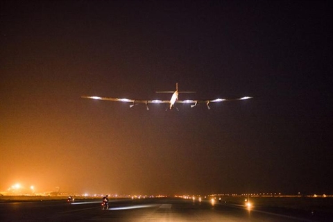 | Solar Impulse 2 décolle de l'aéroport de Varanasi en Inde, le 19 mars. |