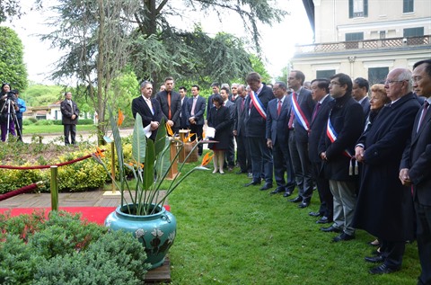 | Une délégation vietnamienne et des amis français visitent l’espace dédié à la mémoire de Hô Chi Minh au parc Montreau. |