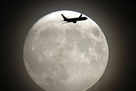 | Un avion passe devant la lune en approchant de l'aéroport d'Heathrow à Londres, le 13 novembre. |