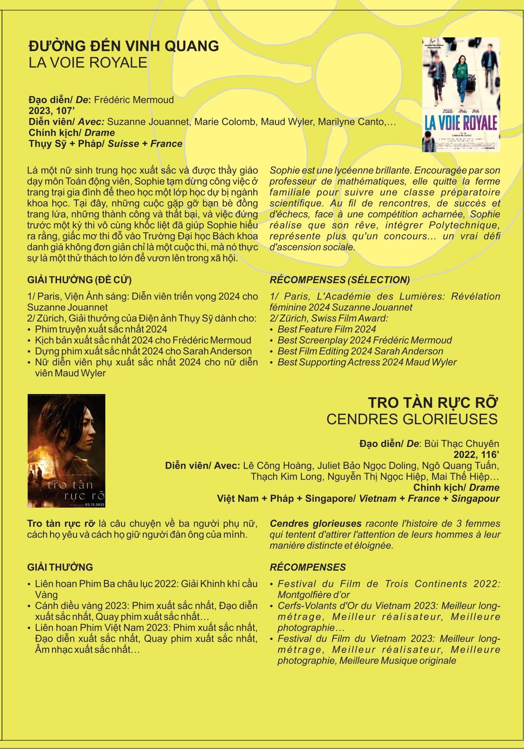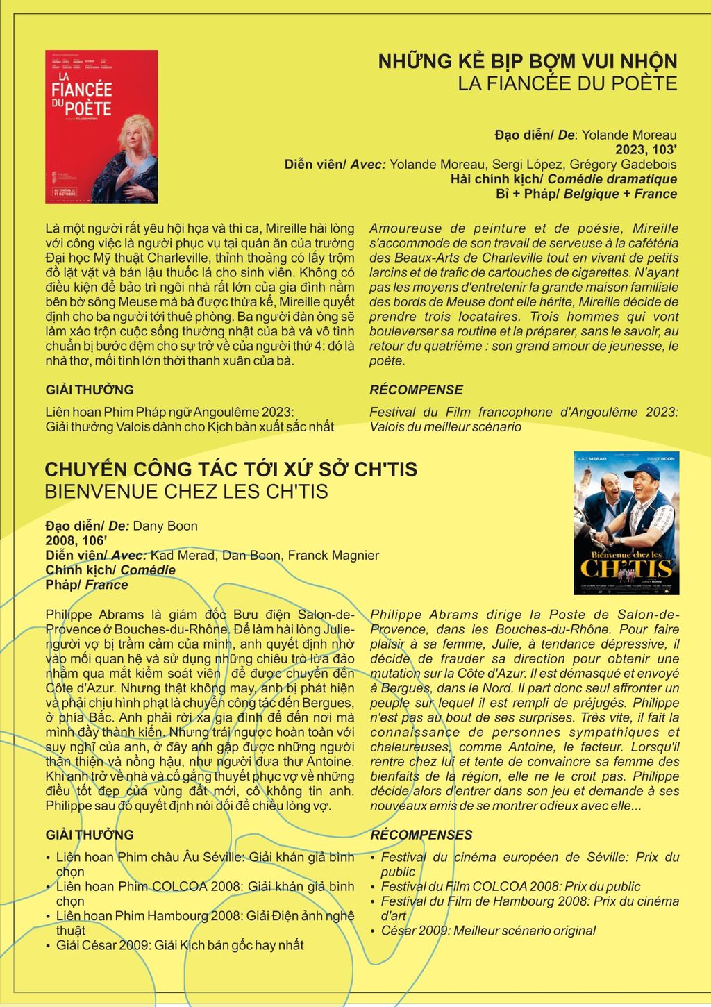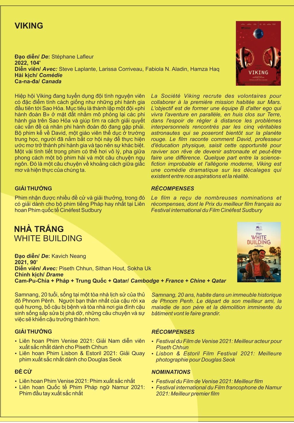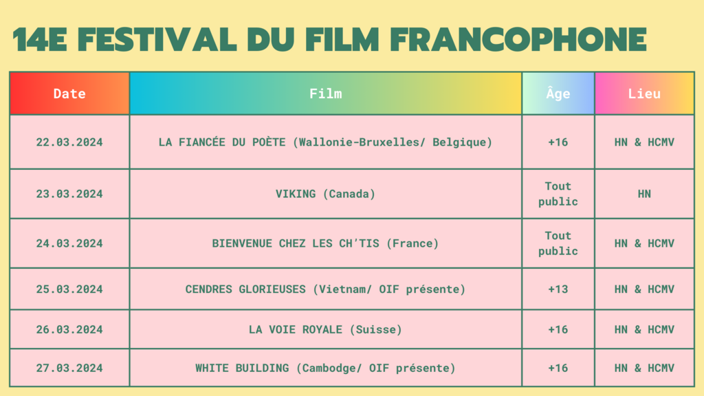 | La liste des films qui seront projetés dans le cadre du 14e festival du film francophone au Vietnam. |