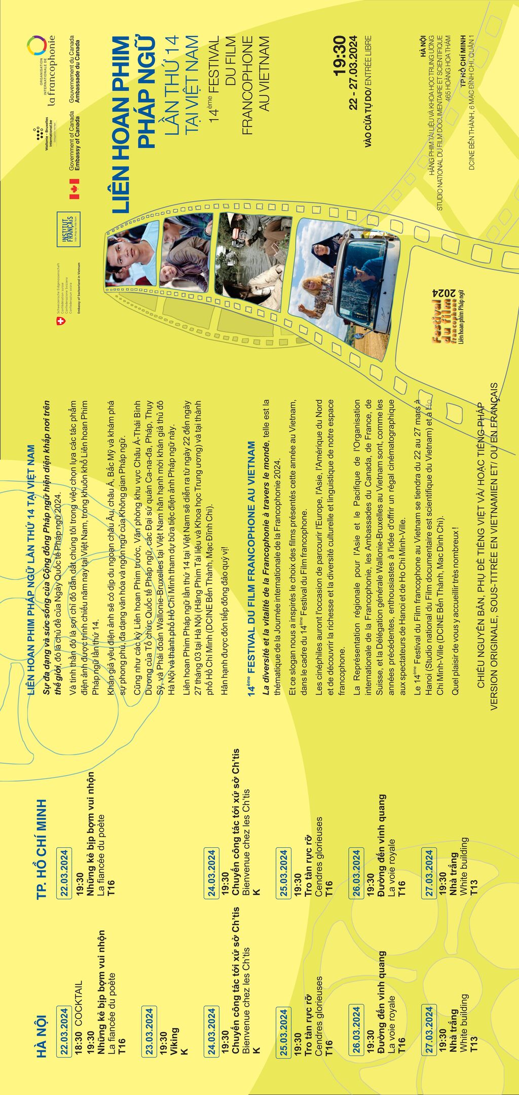 La Représentation régionale pour l’Asie et le Pacifique de l’Organisation internationale de la Francophonie (REPAP), ainsi que les ambassades du Canada, de France, de Suisse, et la Délégation générale Wallonie-Bruxelles au Vietnam sont, comme les années précédentes, enthousiastes à l'idée d’offrir un festin cinématographique aux spectateurs de Hanoï et de Hô Chi Minh-Ville.