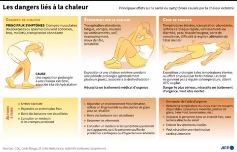 | Graphique sur les symptômes les plus courants et les effets sur la santé causés par la chaleur extrême, ainsi que sur les principales actions à faire. |