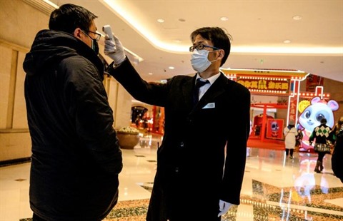 | Un employé prend la température d'un passant dans un centre commercial de Shanghai (Chine), le 8 février. |