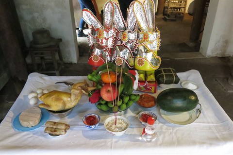 | Un autel comportant des plats et des vêtements en papier pour le culte des Génies du Foyer. |