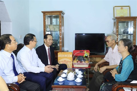 | Le président Trân Dai Quang (3e à gauche) a offert des cadeaux à Dang Thi Thu dans le village de La Tiên, commune de Nguyên Hoa, pour les contributions de sa famille à la révolution nationale. |