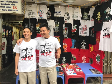 | Les T-shirts aux images des deux présidents des États-Unis et de la RPDC sont bien vendus dans les boutiques à Hanoï. |