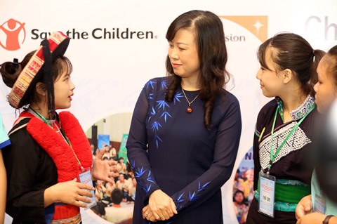 | La vice-ministre du Travail, des Invalides de guerre et des Affaires sociales Dào Hông Lan (centre) discute avec des enfants lors du forum à Hanoï. |