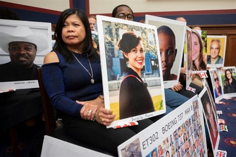 | Des parents de victimes du crash, en mars 2019, du Boeing 737 MAX d'Ethiopan Airlines, à Washington le 11 décembre 2019. |