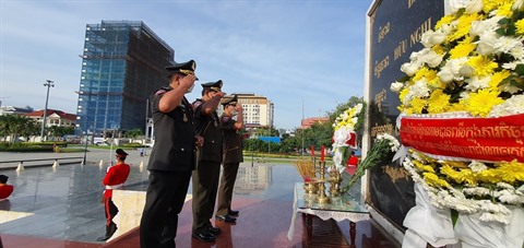 Dans la matinée du même jour, une délégation de l'Armée royale du Cambodge, conduite par le général Chieng Am, secrétaire d'État du ministère cambodgien de la Défense, est venue déposer des gerbes de fleurs au Monument de l'amitié Vietnam - Cambodge à Phnom Penh pour honorer les héros et martyrs morts pour la cause révolutionnaire.