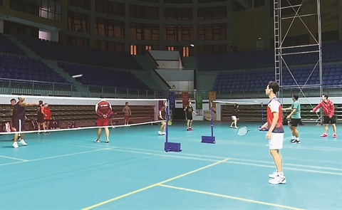 | La sélection nationale de badminton à l’entraînement au Palais omnisport de la province de Bac Giang, au Nord. |