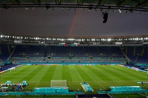 | Un arc-en-ciel surplombe le Stadio Olimpico, le 10 juin 2021, à Rome, la veille du match d'ouverture de l'Euro 2020 entre l'Italie et la Turquie. |