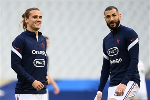 | Les attaquants Antoine Griezmann et Karim Benzema, à l'échauffement avant le match amical contre la Bulgarie, le 8 juin 2021 au Stade de France à Saint-Dernier, dernier match de préparation avant l'Euro 2020. |