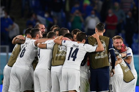 | Les Italiens fêtent leur victoire à l'issue du match d'ouverture de l'Euro contre les Turcs, à Rome, le 11 juin 2021. |