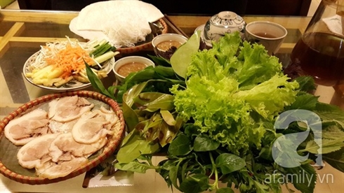 Arrivés ici, les convives seront d’abord invités à déguster le plat banh trang phoi suong avant de déguster le banh canh de Trang Bàng. L’entrée, appelée banh trang phoi suong, n’est pas un plat d’ici mais une spécialité de la province de Tây Ninh. Elle est servie avec des morceaux de porc bouillis. Et, en accompagnement, quelques légumes que l’on ne peut trouver qu’à Tây Ninh.