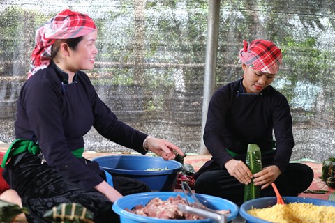 08h00. La maison de Hoàng Thi Huê, située dans le chef-lieu de Khanh Yên, (district de Van Bàn, province de Lào Cai) accueille un grand nombre de femmes de l’ethnie Tày venues aider à la confection d’un plat traditionnel local, le bánh chưng gù. Les femmes s’activent. Aujourd’hui, de nombreux clients ont passé commande…"Bánh chưng gù est une spécialité des Tày à Van Bàn. Le nom et la forme cylindrique du gâteau de riz gluant évoquent l'image de la femme portant un panier et se courbant dans les champs. Aujourd’hui, nous utilisons cette image pour louer la beauté et le courage de ces femmes vivant dans les hautes montagnes", fait savoir Hoàng Thi Huê, de l'ethnie Tày dans le chef-lieu de Khanh Yên. et d'ajouter que "normalement, chaque jour, nous confections environ 400-500 unités. Principalement, nous confectionnons les produits en fonction des commandes et nous vendons aussi au marché local. C’est à l’approche des fêtes traditionnelles que la production est la plus importante".