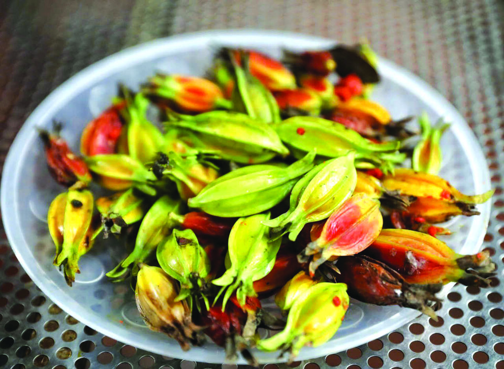 | Les fruits "dành dành" (lilly) créent la couleur jaune du gâteau des mariés. |
